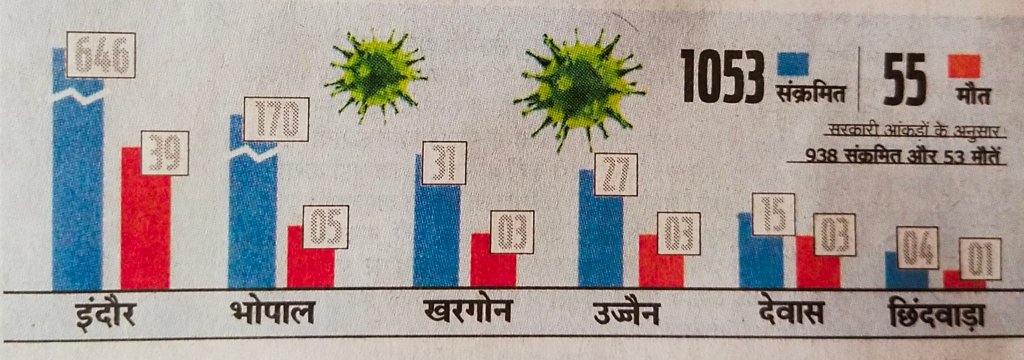 खंडवा में 32, मुरैना में 14, बड़वानी में 17 होशंगाबाद में 15, विदिशा में तेरह, जबलपुर में 13, रतलाम में 12, ग्वालियर में 6, मंदसौर में 7 एक की मौत, शाजापुर में सात,धार में 5, रायसेन में चार, आगर मालवा चार, शिवपुर में तीन, सतना में दो,शिवपुरी में दो, बेतूल में एक, सागर में एक, उमरिया एक, टीकमगढ़ में एक संक्रमित है।