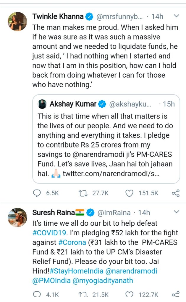 अक्षय कुमार ने दिया 25 करोड़ का दान, पीवी सिंधु-कपिल शर्मा सहित इन सेलेब्स ने CORONAVIRUS से लड़ने के लिए दिए